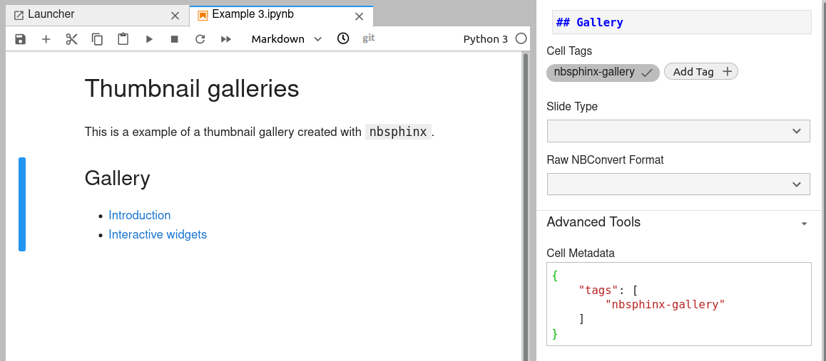 • From a Jupyter notebook, adding a "nbsphinx-gallery" tag to the metadata of a cell. Each editor has a different way of modifying the cell metadata (see figure below).