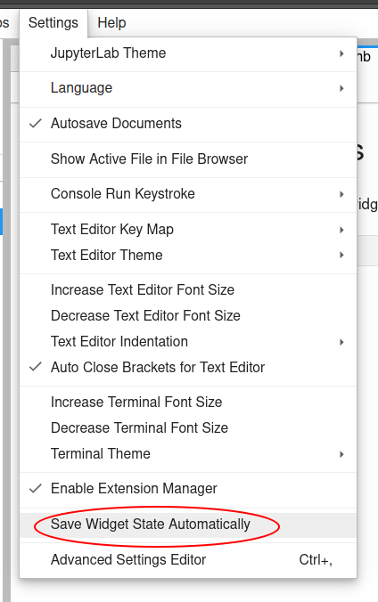 • JupyterLab provides a “Save Widget State Automatically” option in the “Settings” menu. You need to leave it checked so that widget state is automatically saved.
